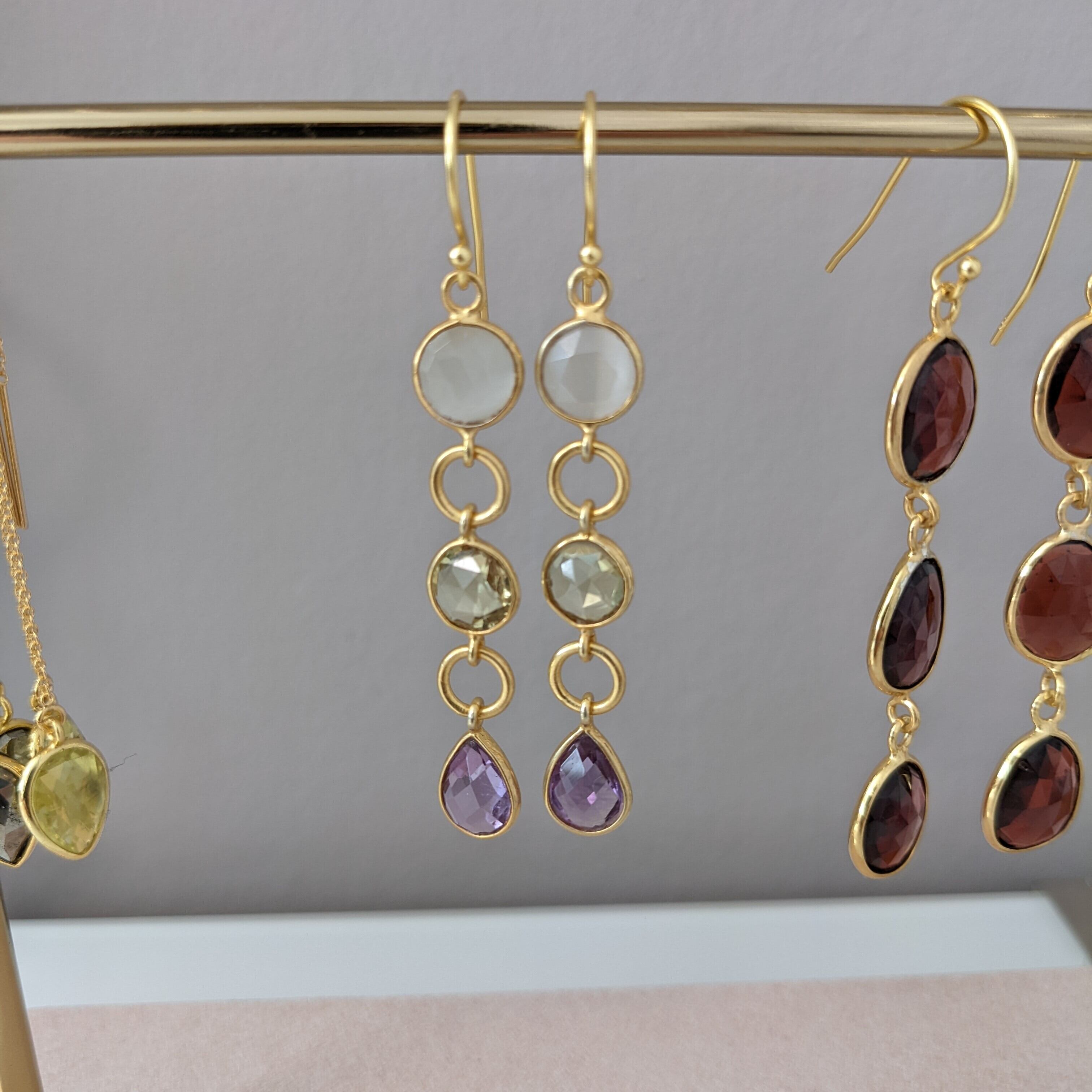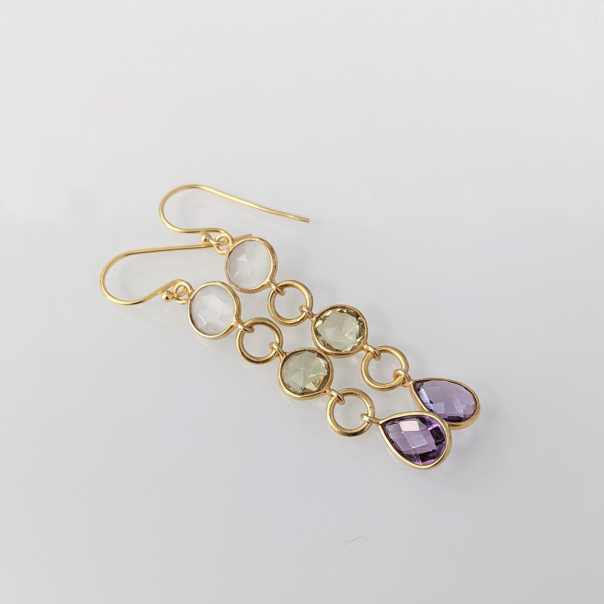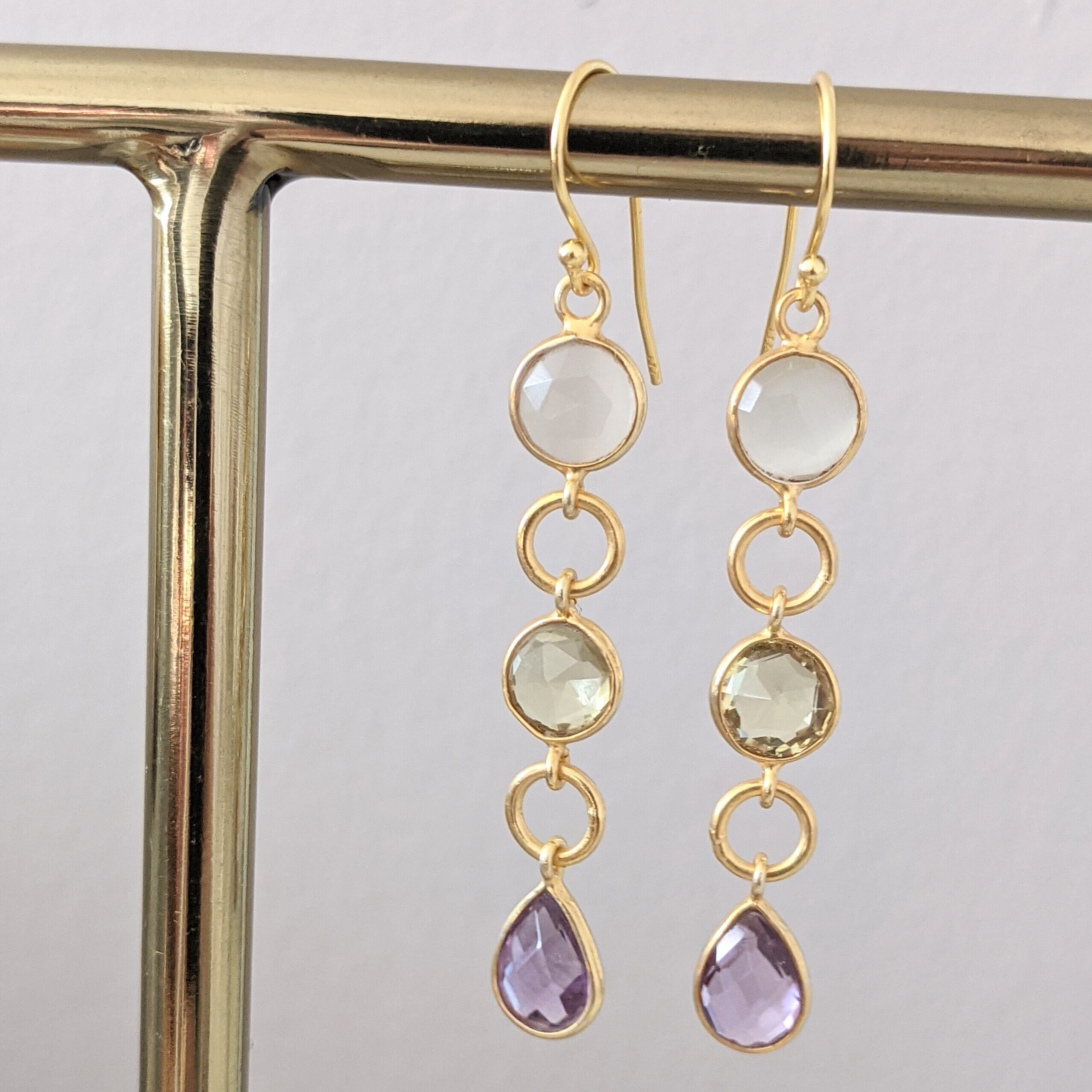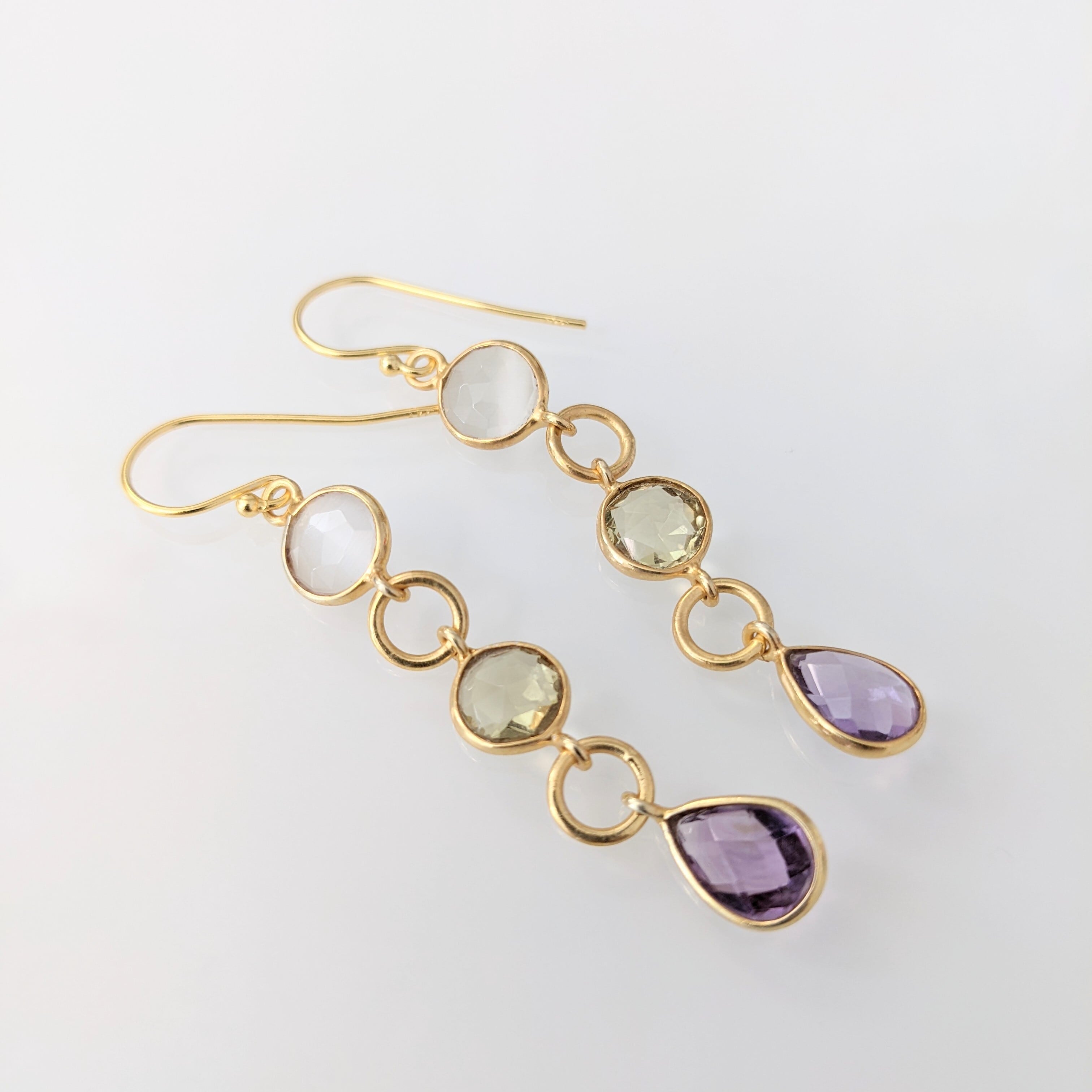 ムーンストーン、アメジストとレモントパーズのロングピアス